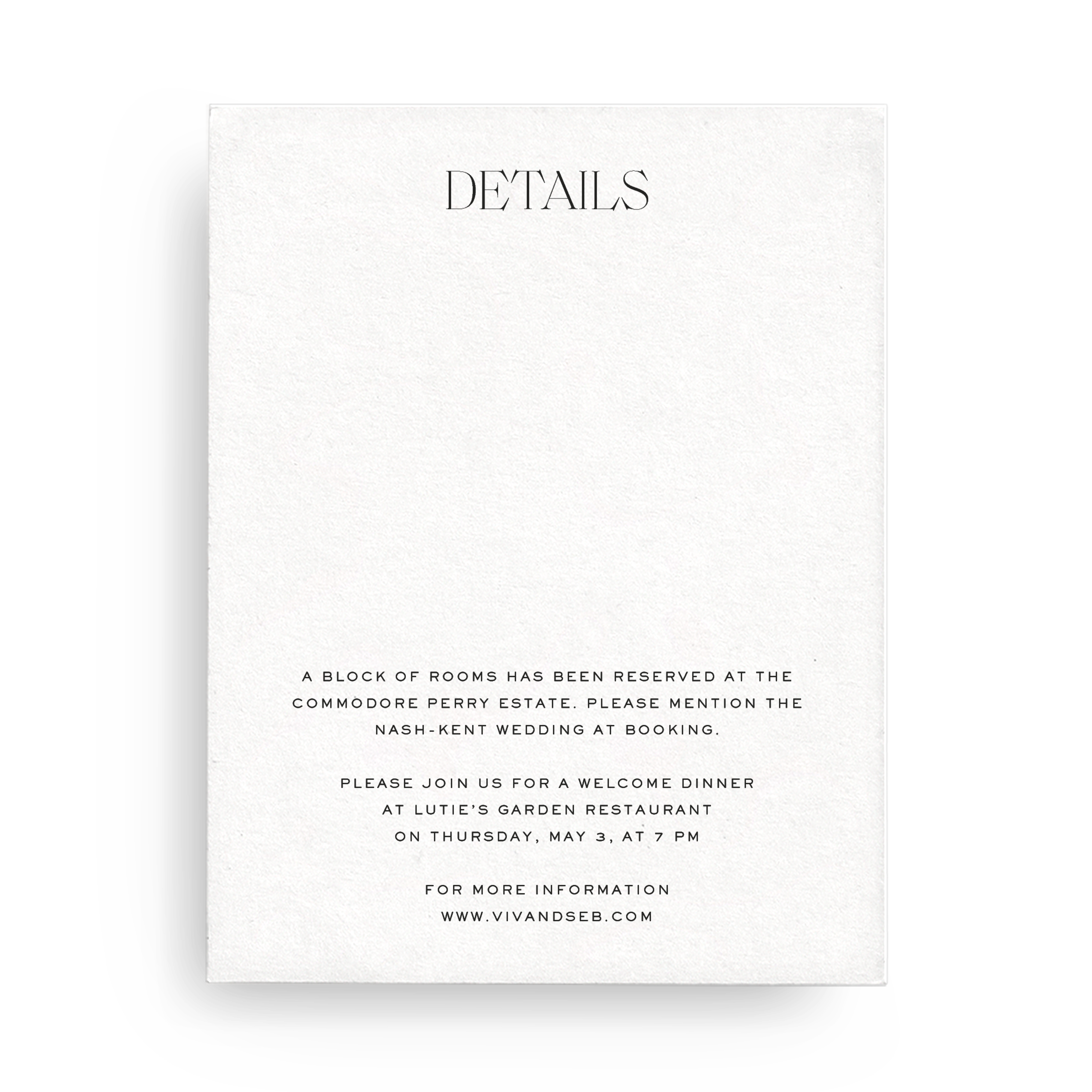 To convey the finer points of your celebration—from digital QR codes to notes on transportation—our thoughtfully composed enclosure cards ensure every guest feels anticipated and informed. Our designers will then arrange your provided text, introducing subtle variations in scale and typography for a dynamic yet harmonious effect. Refine your suite further with elevated options like double-thick papers and tactile letterpress printing, all available within the customization form.