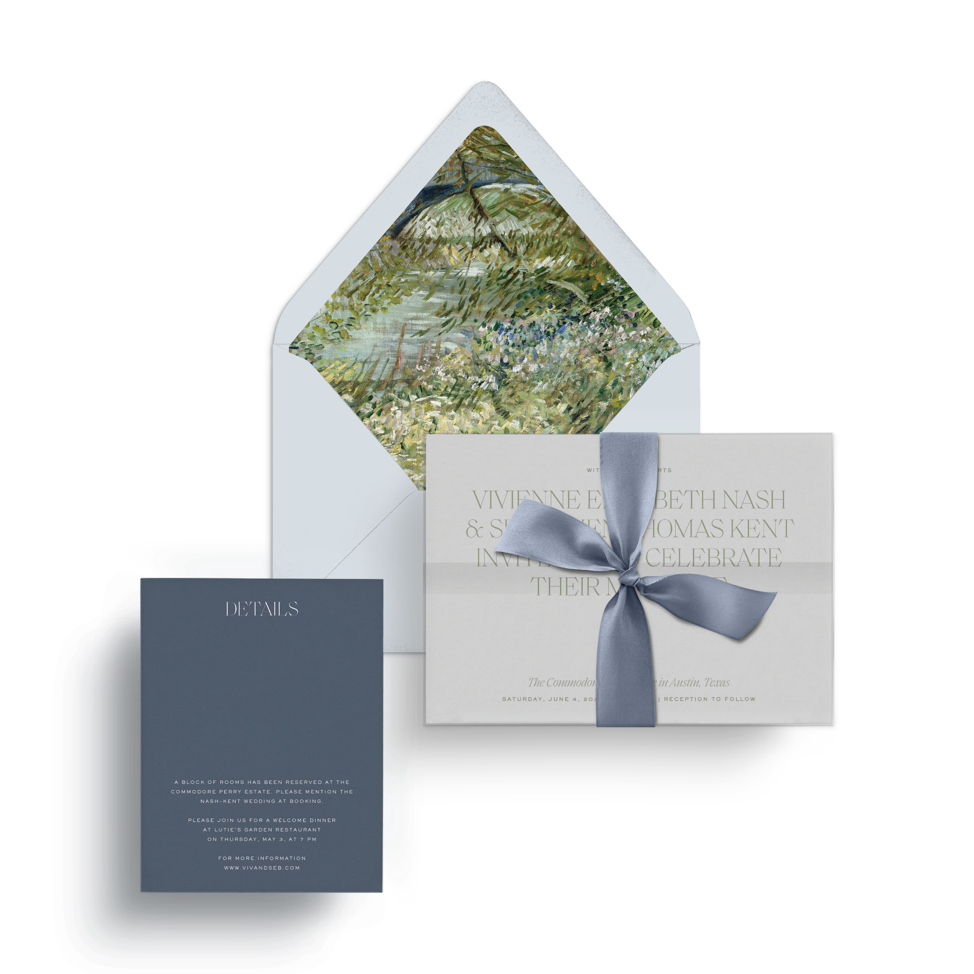 An artful curation of our Lucca Collection, defined by a palette of serene slate blue, deep navy, and the watery hues of a painterly landscape. Inspired by the tranquil light of a riverside setting, this edit is designed for celebrations of contemporary and artful elegance. Explore an atmosphere of painterly romance.