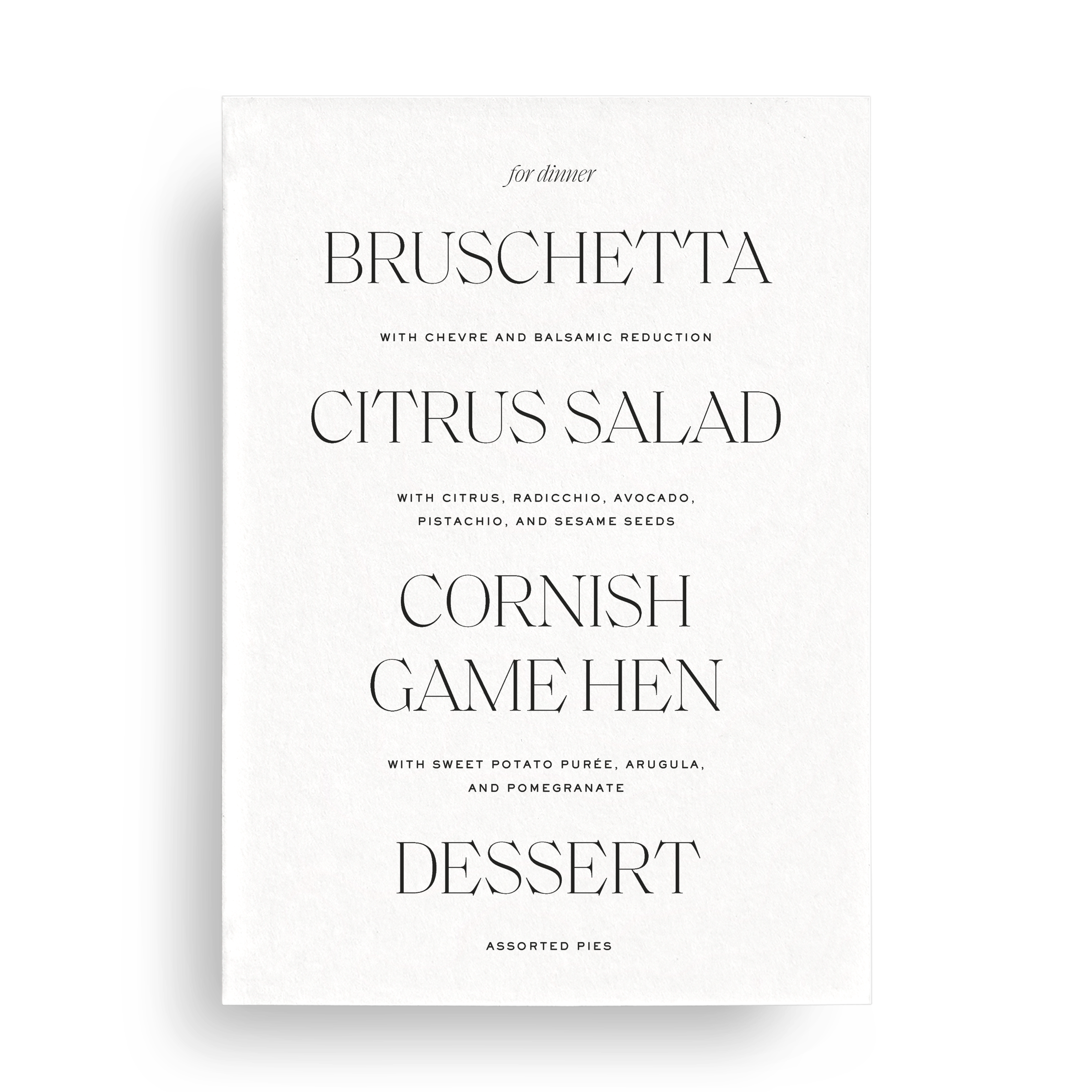 A refined finishing touch for your tablescape. Customize each menu by selecting your preferred font, ink, and paper. Additional options, including letterpress printing, substantial double-thick paper, and colored cardstock, are available for a more distinct presentation.