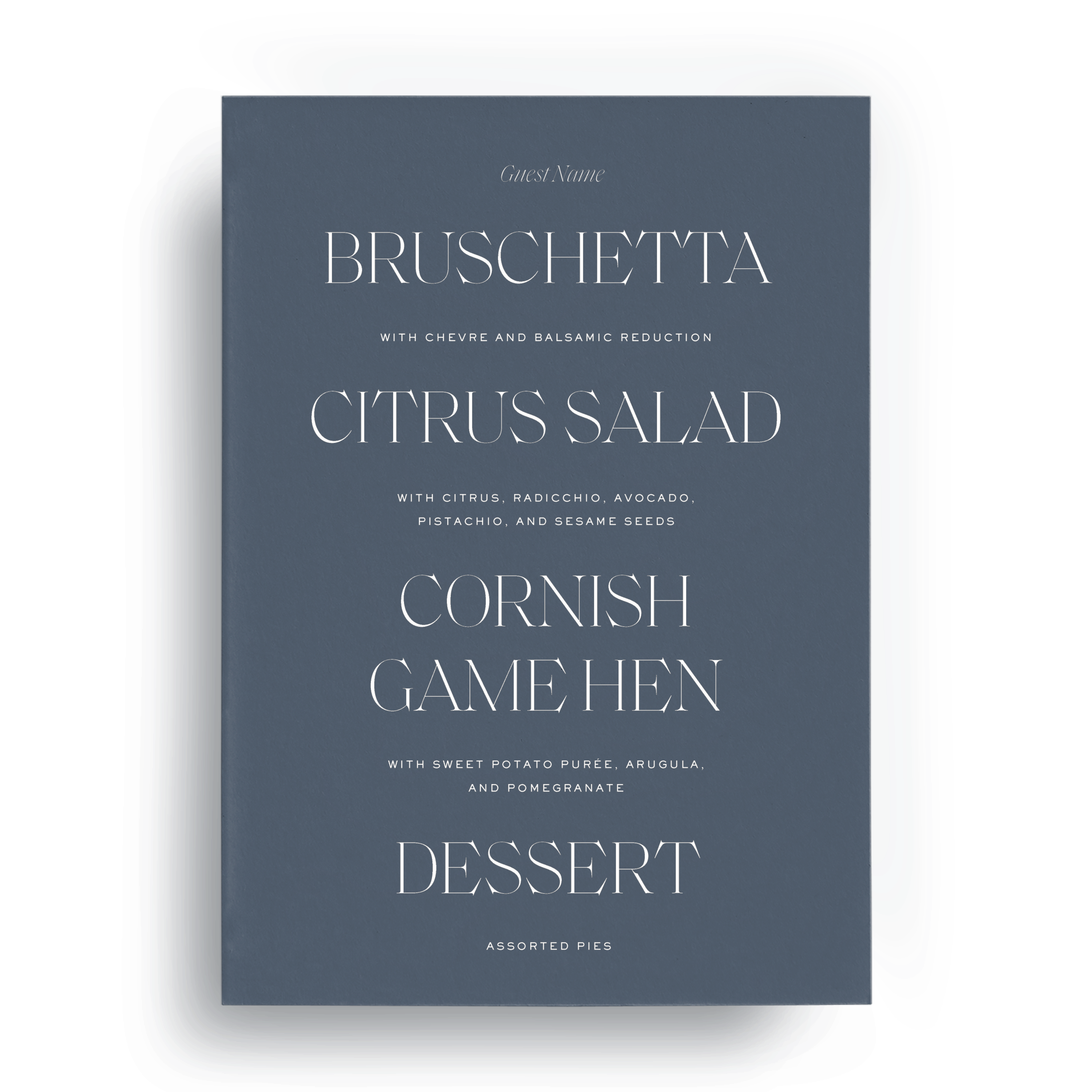 For an effortless dining experience, menus can be personalized with guest names and their selected entrées. Each is further customized with your choice of font, ink, and paper, with options for double-thick or colored stock for a distinct finish.