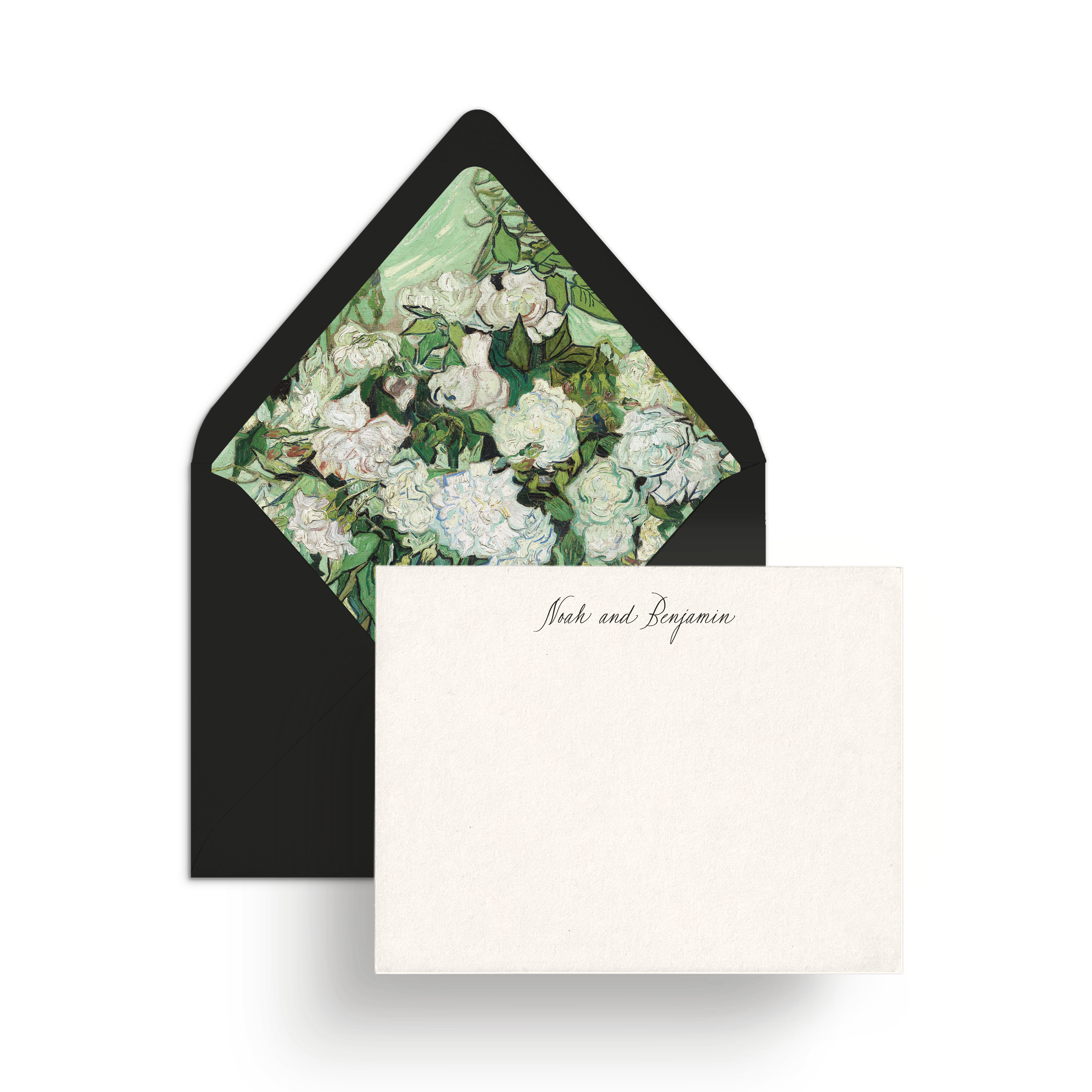Flat cards in your choice of print and paper color, paired with envelopes in complementary or contrasting tones. Optional envelope liners and addressing transform simple correspondence into considered gestures. Choose from our curated typography collection to complete your custom suite.