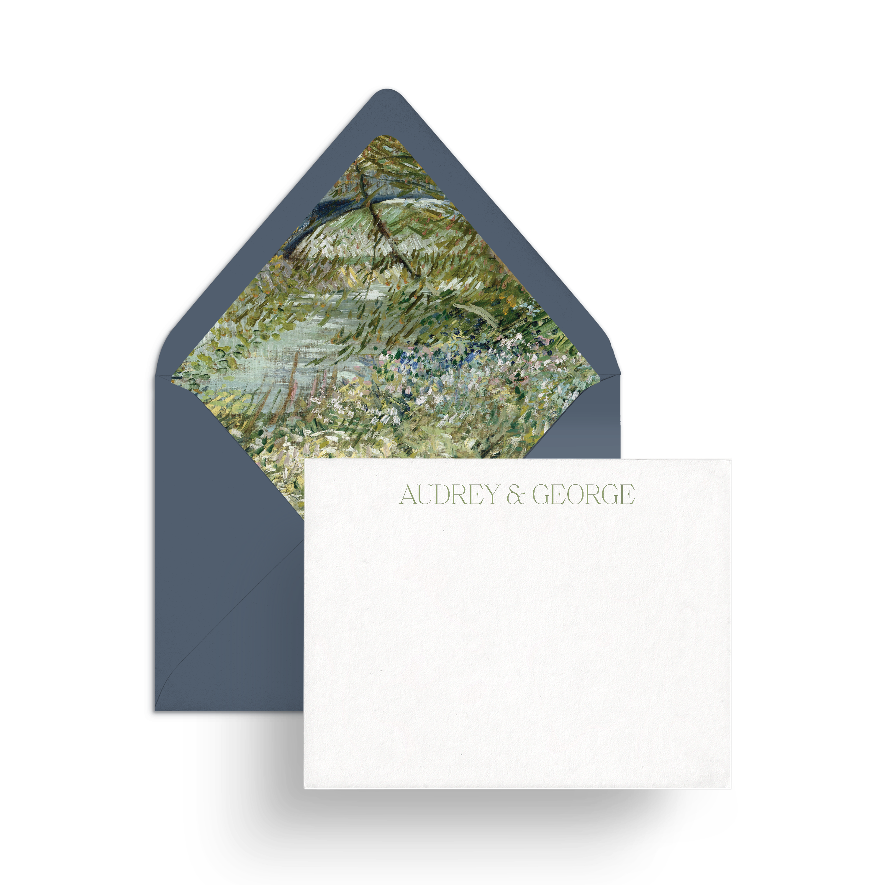 Flat cards in your choice of print and paper color, paired with envelopes in complementary or contrasting tones. Optional envelope liners and addressing transform simple correspondence into considered gestures. Choose from our curated typography collection to complete your custom suite.