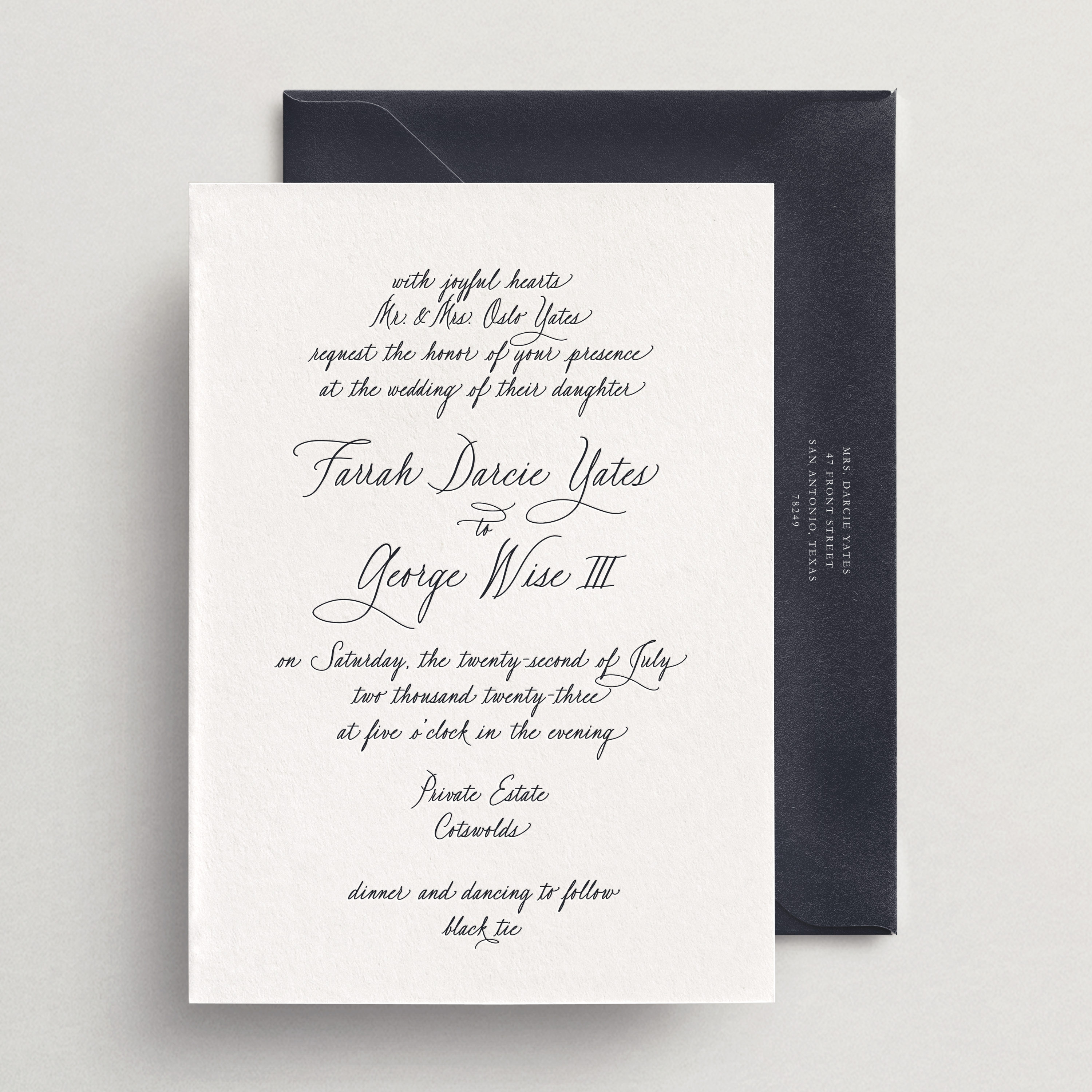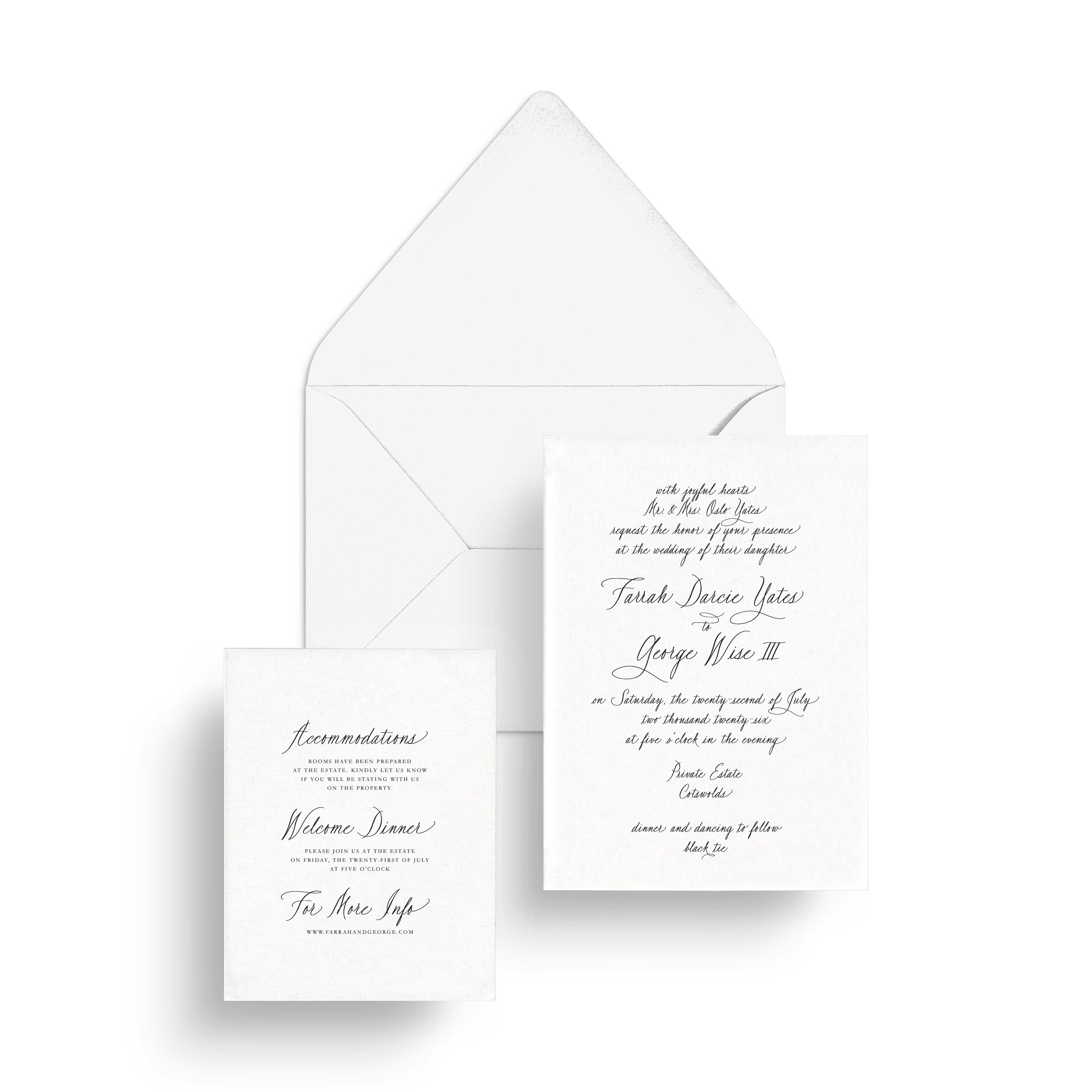 A canvas for your personal aesthetic. From this starting point, articulate your vision through your choice of color and print, and add dimension with details such as a custom venue illustration, the soft flourish of a silk ribbon, or the clean line of a shaped-edge card.