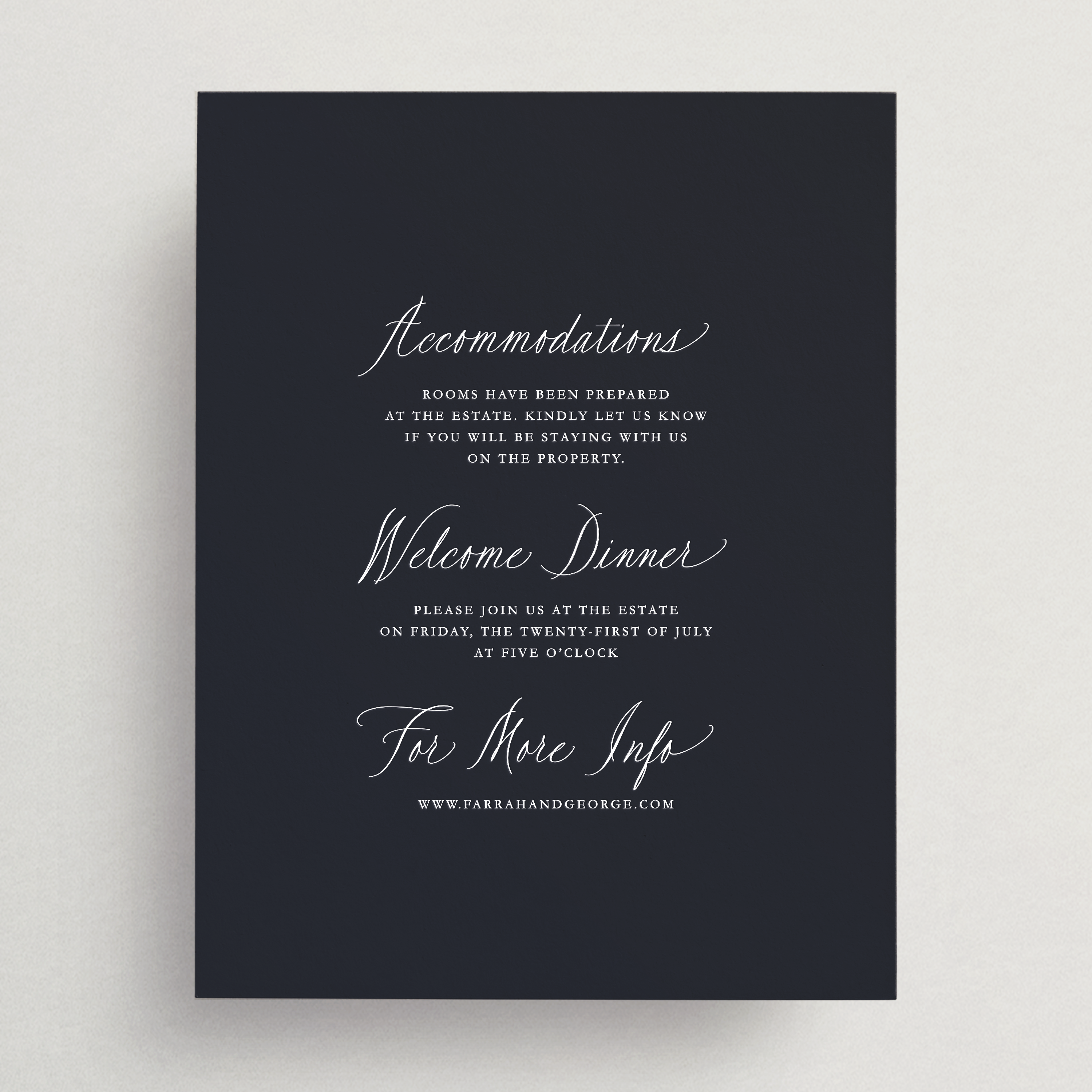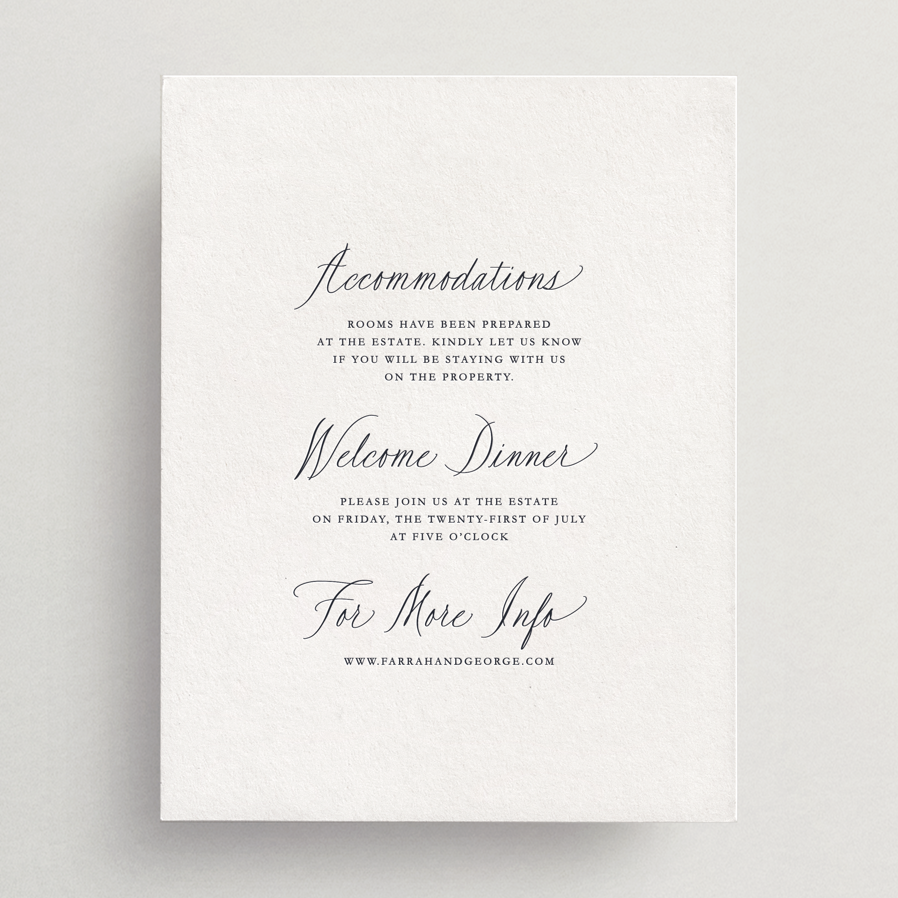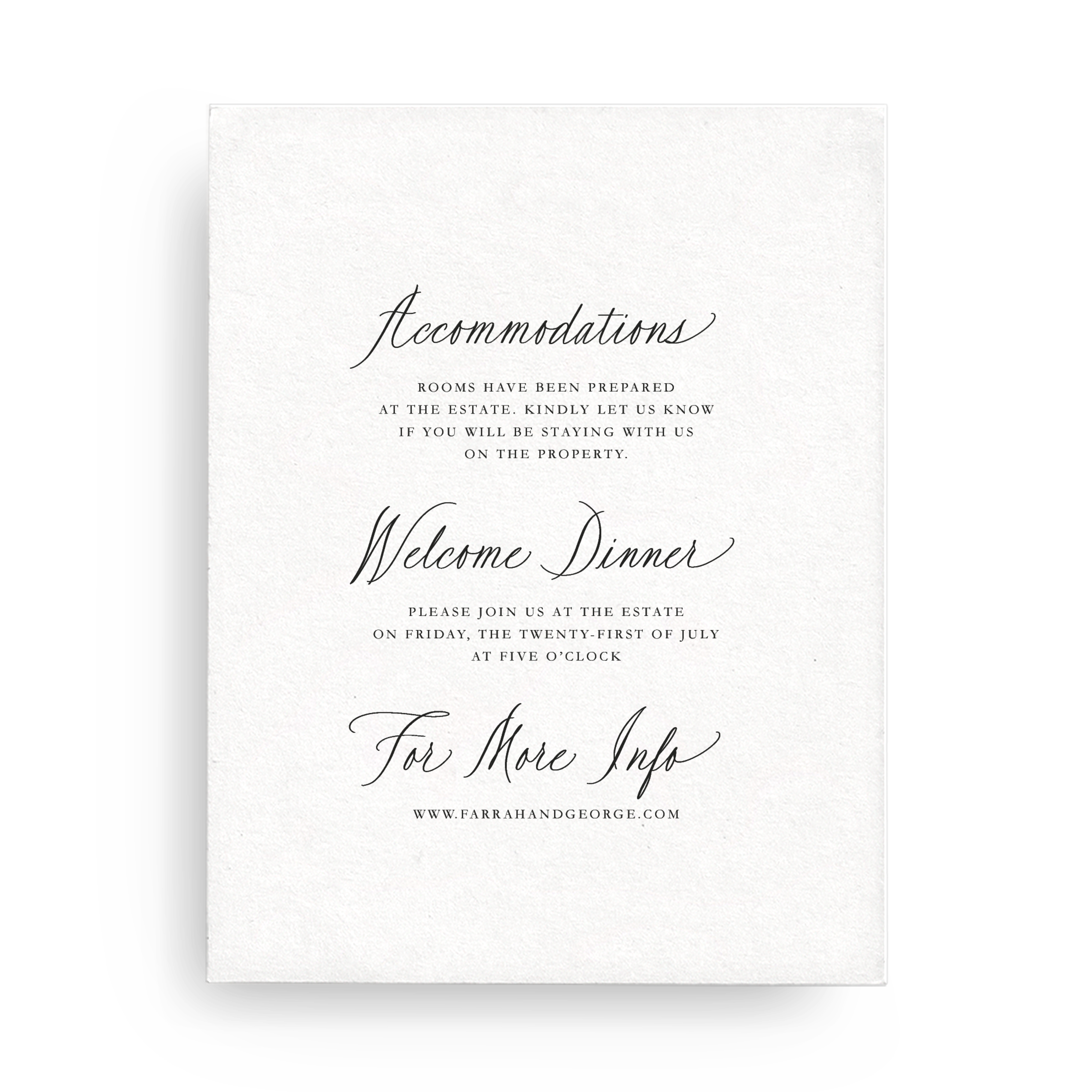 To convey the finer points of your celebration—from digital QR codes to notes on transportation—our thoughtfully composed enclosure cards ensure every guest feels anticipated and informed. Our designers will then arrange your provided text, introducing subtle variations in scale and typography for a dynamic yet harmonious effect. Refine your suite further with elevated options like double-thick papers and tactile letterpress printing, all available within the customization form.