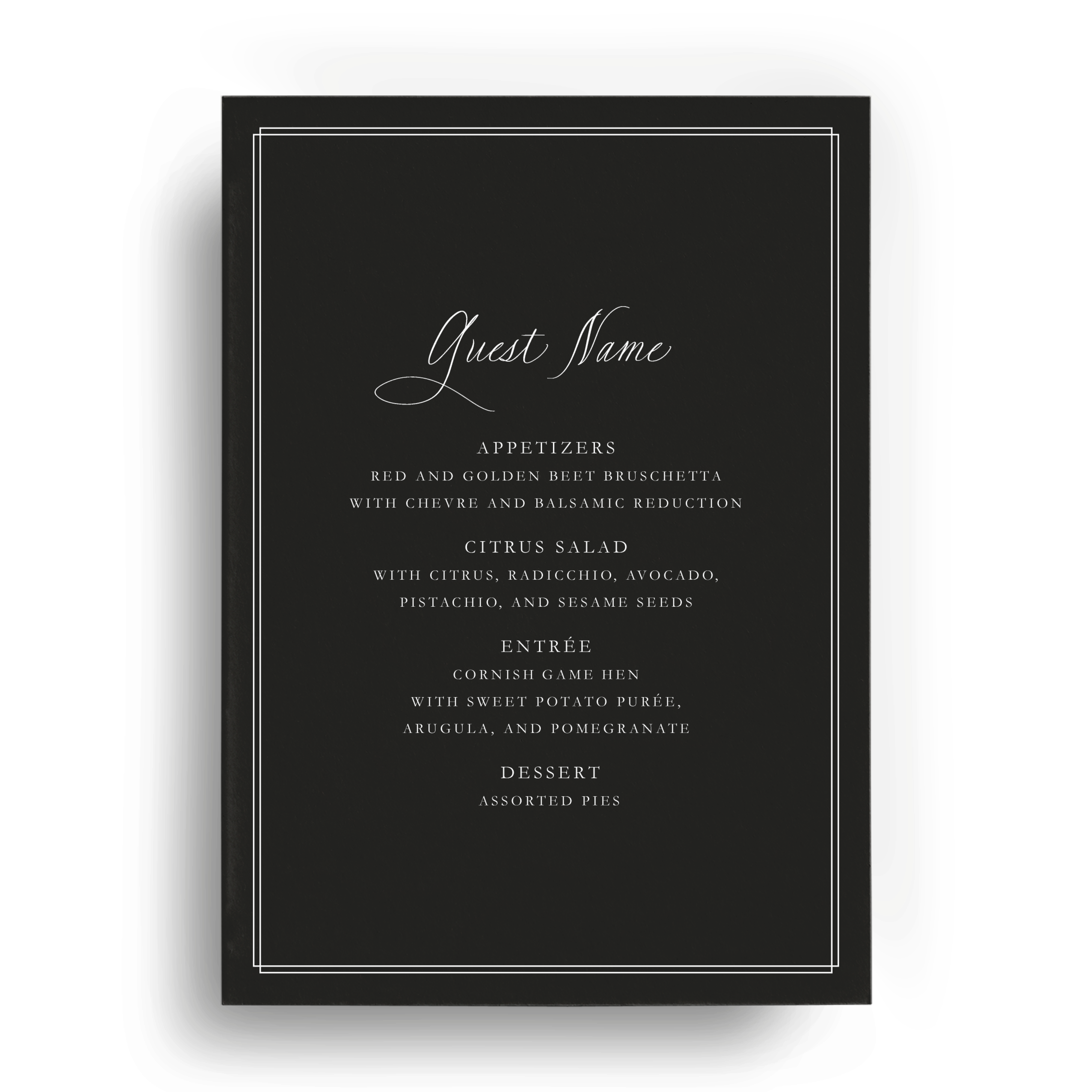 For an effortless dining experience, menus can be personalized with guest names and their selected entrées. Each is further customized with your choice of font, ink, and paper, with options for double-thick or colored stock for a distinct finish.