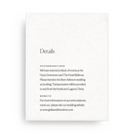 To convey the finer points of your celebration—from digital QR codes to notes on transportation—our thoughtfully composed enclosure cards ensure every guest feels anticipated and informed. Our designers will then arrange your provided text, introducing subtle variations in scale and typography for a dynamic yet harmonious effect. Refine your suite further with elevated options like double-thick papers and tactile letterpress printing, all available within the customization form.