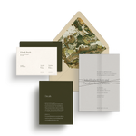 Alongside a complete invitation suite, your kit includes our comprehensive 3"x4" swatch deck. This tactile collection of sample cards is secured with a single, removable binding screw. We invite you to unfasten it and lay the colors side-by-side, allowing you to physically build and visualize your final palette.