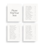 Guide guests to their seats with our seating chart options. Choose printed 8x10 cards on your choice of paper color and weight, with complimentary self-adhesive cardboard easel stands included for freestanding display—we'll determine how many cards are needed based on your guest count and arrange names across them for optimal readability. Or select a digital file in your preferred size for large-format printing. All seating charts are formatted alphabetically by last name unless you request an alternative arrangement (such as by table).