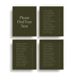 Guide guests to their seats with our seating chart options. Choose printed 8x10 cards on your choice of paper color and weight, with complimentary self-adhesive cardboard easel stands included for freestanding display—we'll determine how many cards are needed based on your guest count and arrange names across them for optimal readability. Or select a digital file in your preferred size for large-format printing. All seating charts are formatted alphabetically by last name unless you request an alternative arrangement (such as by table).