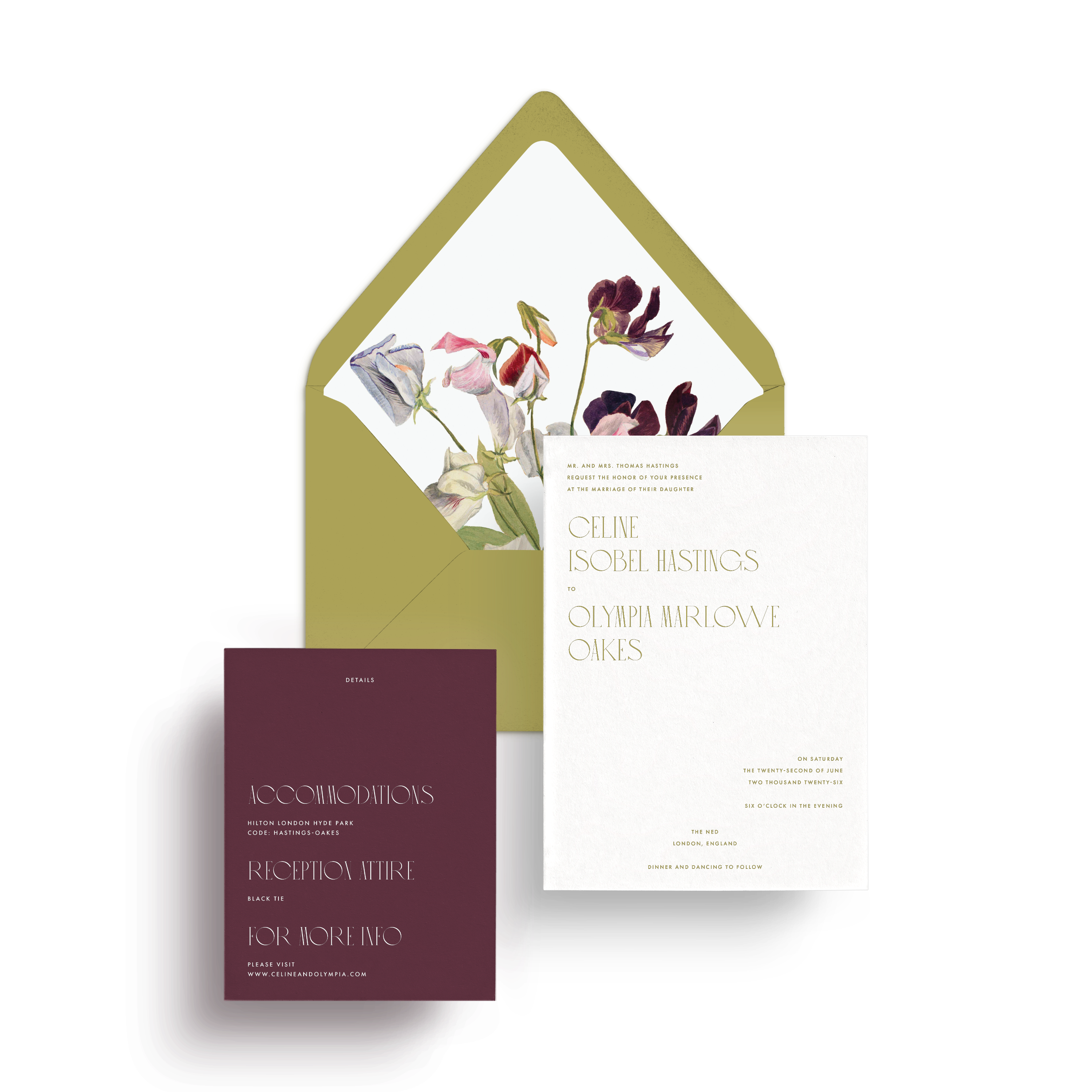 A canvas for your personal aesthetic. From this starting point, articulate your vision through your choice of color and print, and add dimension with details such as a custom venue illustration, the soft flourish of a silk ribbon, or the clean line of a shaped-edge card.
