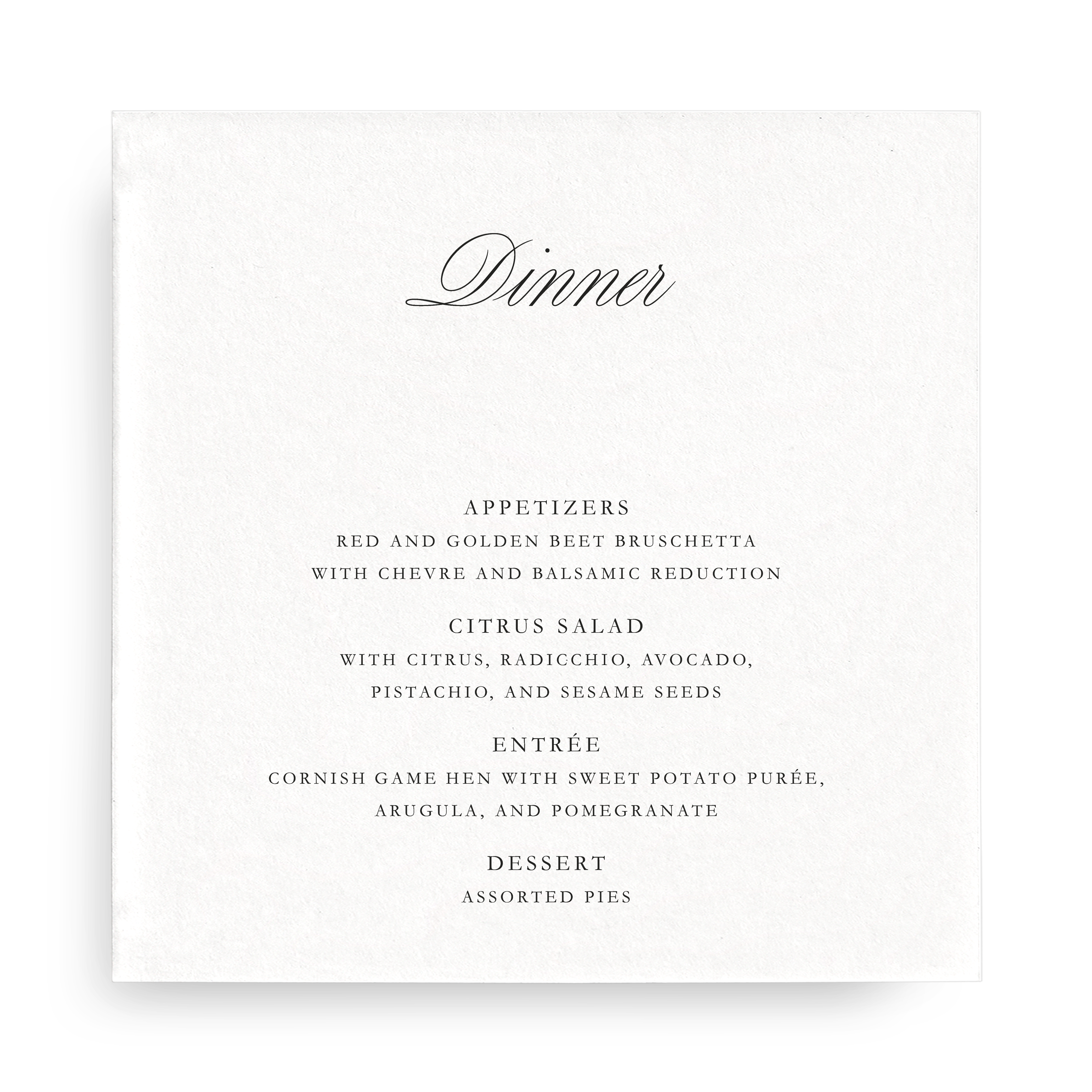 A refined finishing touch for your tablescape. Customize each menu by selecting your preferred font, ink, and paper. Additional options, including letterpress printing, substantial double-thick paper, and colored cardstock, are available for a more distinct presentation.