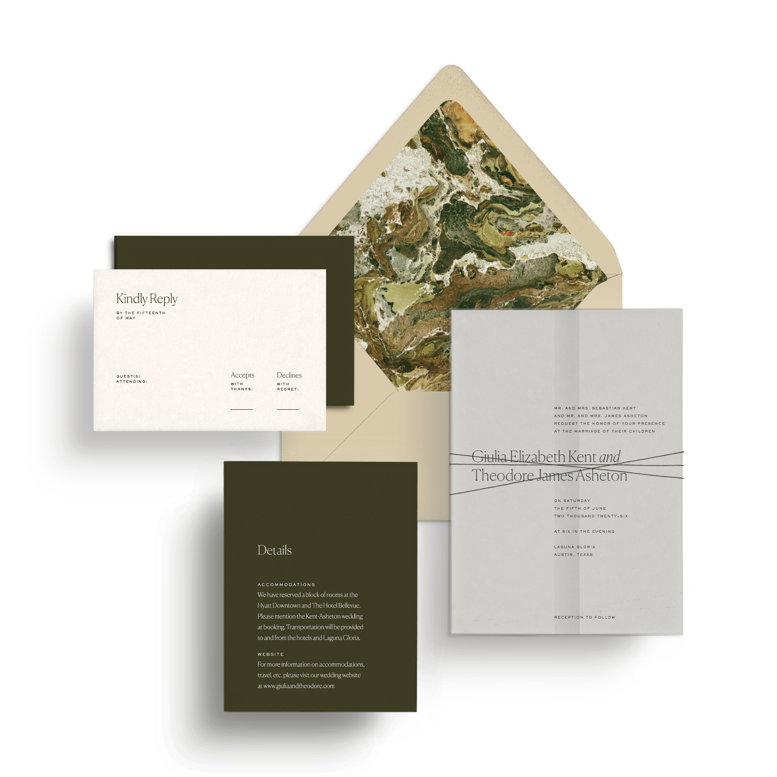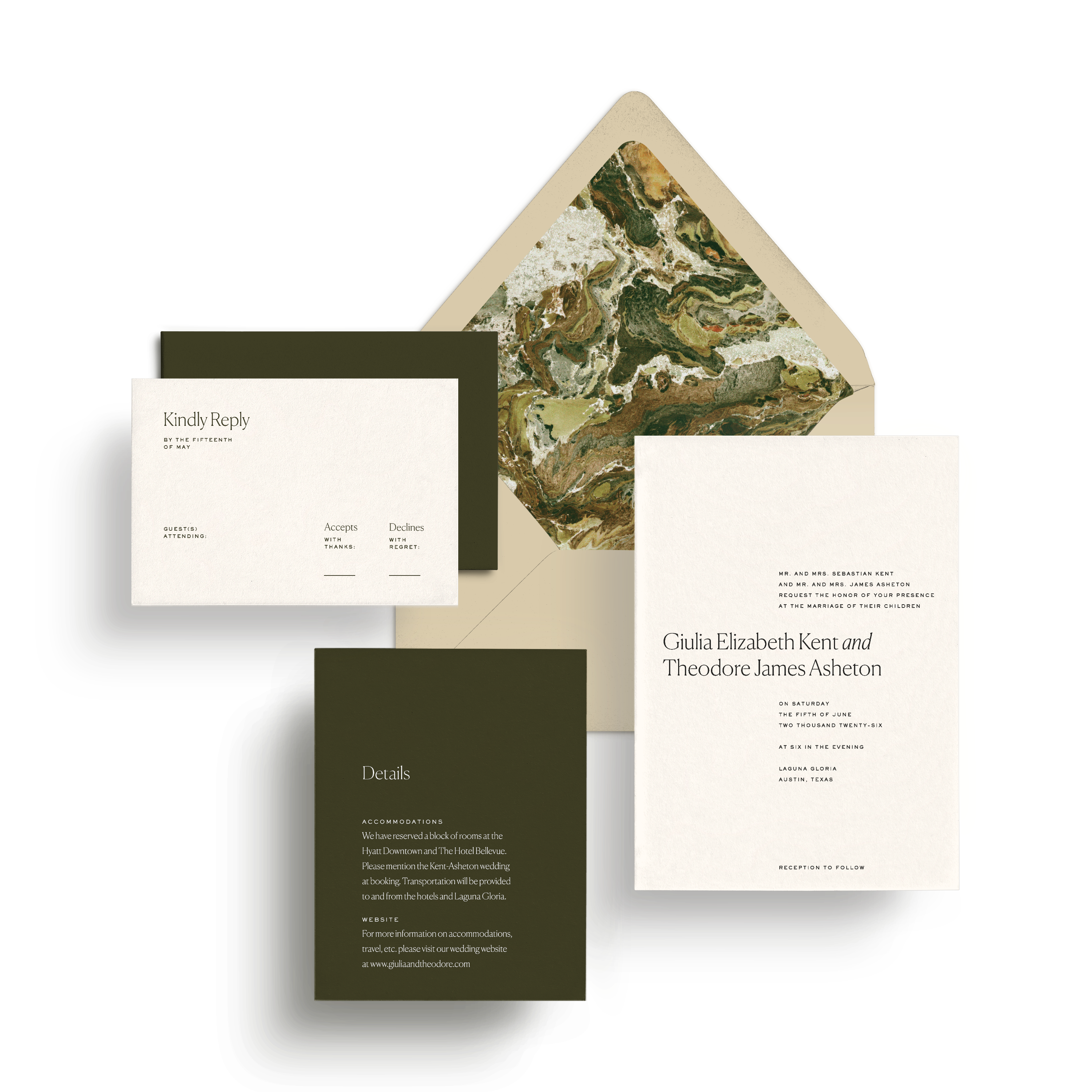 An editorial curation of our Palermo Collection, characterized by deep olive, architectural cream, and organic marbling that reads like aerial topography. Drawn from the intersection of nature and modernism—where organic patterns meet structured design. This palette speaks to contemporary minimalism with textural depth. The marbled liner transforms each envelope into a geological study. This edit cultivates an atmosphere of gallery-worthy restraint.