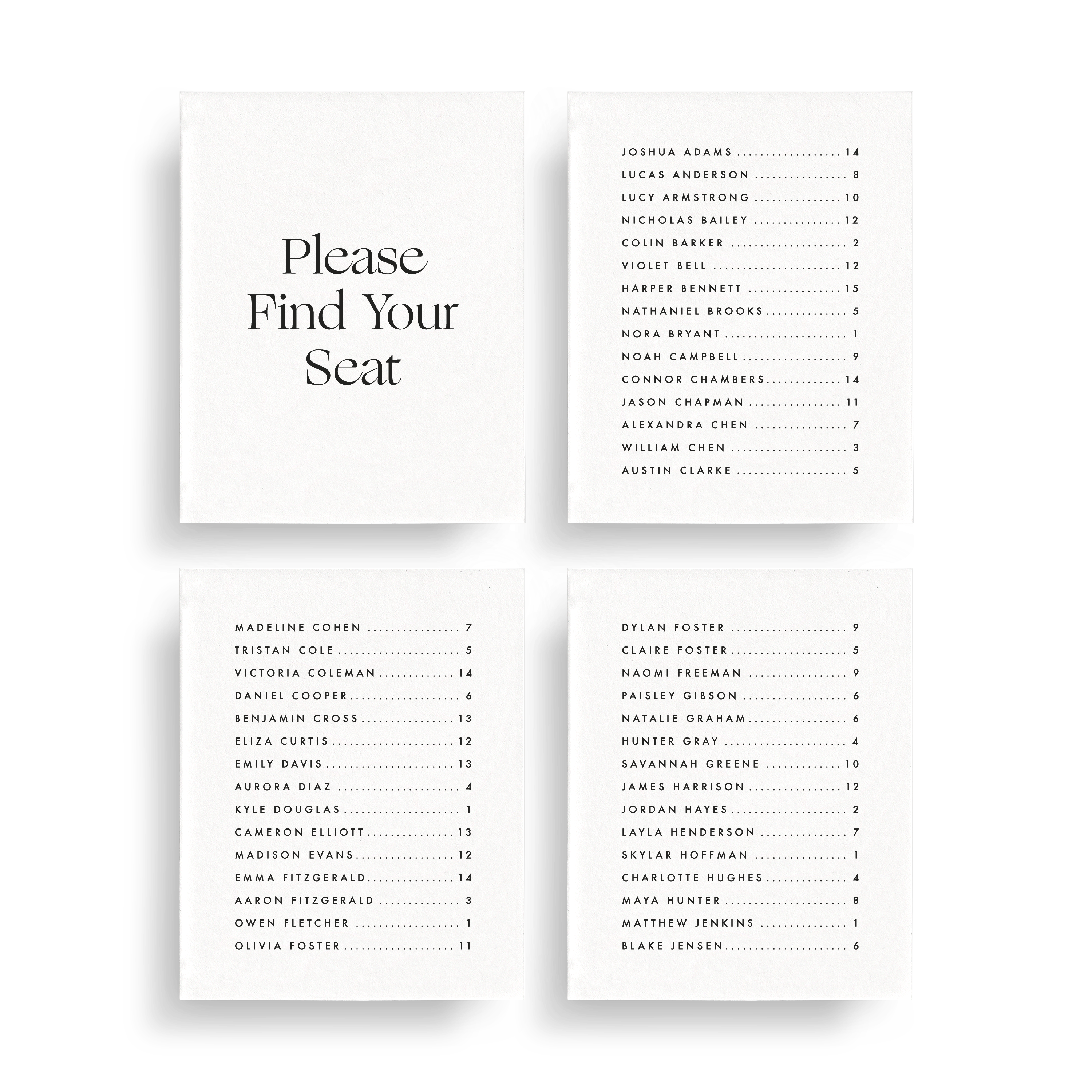 Guide guests to their seats with our seating chart options. Choose printed 8x10 cards on your choice of paper color and weight, with complimentary self-adhesive cardboard easel stands included for freestanding display—we'll determine how many cards are needed based on your guest count and arrange names across them for optimal readability. Or select a digital file in your preferred size for large-format printing. All seating charts are formatted alphabetically by last name unless you request an alternative arrangement (such as by table).