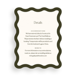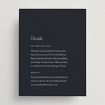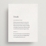To convey the finer points of your celebration—from digital QR codes to notes on transportation—our thoughtfully composed enclosure cards ensure every guest feels anticipated and informed. Our designers will then arrange your provided text, introducing subtle variations in scale and typography for a dynamic yet harmonious effect. Refine your suite further with elevated options like double-thick papers and tactile letterpress printing, all available within the customization form.